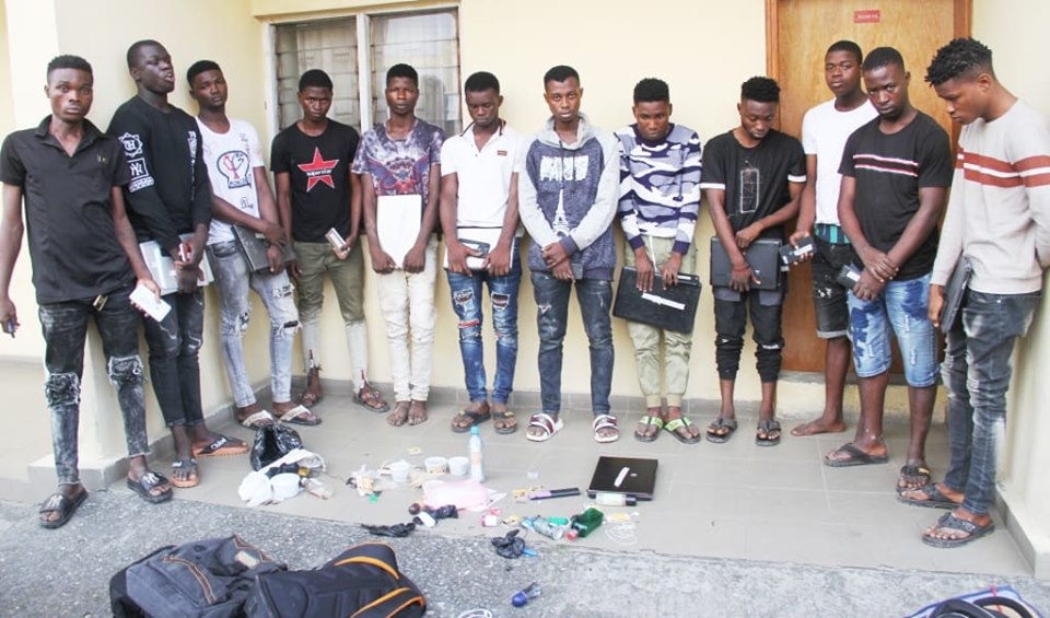The suspects-Oluwaseun Ogunbunmi, Haruna Yusuf , Olubori Hassan, Wasiu Idowu, Basit Adeniran, Aina Olajuwon, Okafor Joseph, David Ado, Olamide Ogunseye, Opeyemi Ahmed , Monsuru Amao, Taiwo Rasak- were arrested on Thursday, August 29, 2019 in a rented three-bedroom apartment in the Ikotun area of Lagos, where they used as a Yahoo Yahoo school.