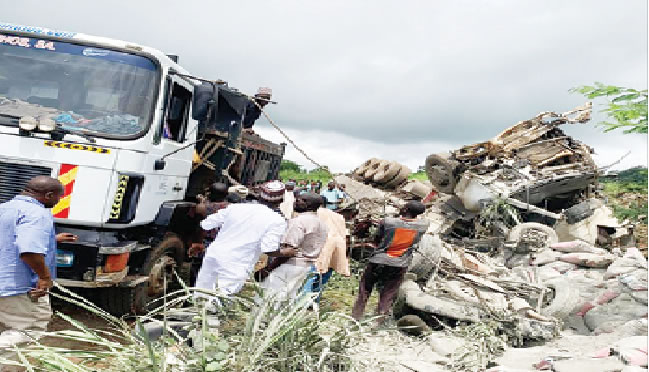 A witness said the brake of a Dangote trailer, marked KMC 523 YD, failed and the trailer first rammed into a 12-tyre truck marked GME 466 XA, conveying beans from Gombe to Aba and later crushed a VW Sharon bus marked KMC 523 YD Sharon car, killing all its nine occupants.